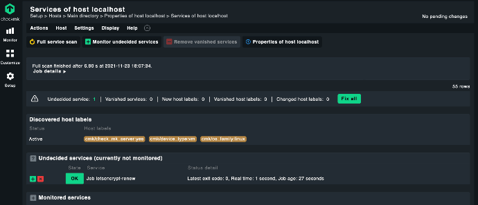 Checkmk has identified new service called: “Job letsencrypt-renew”. We can add this service to the list of monitored services either by clicking on the green button to the left or by clicking “Fix all” . If the job is not yet present in the list, we can execute a full scan of the host by clicking the Full service scan button.